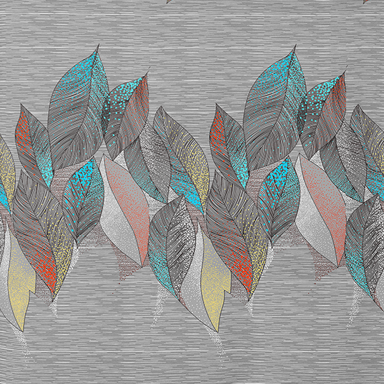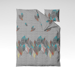 🍃 Jungle Lines – et moderne og energisk design, hvor stiliserede farvede blade leger på en gråstribet baggrund. Turkise, orange, gule og koralfarvede accenter giver designet et nutidigt liv, samtidig med at det bevarer en harmonisk, naturinspireret stil. Et perfekt valg for dem, der ønsker at tilføre farve og struktur til deres soveværelse.